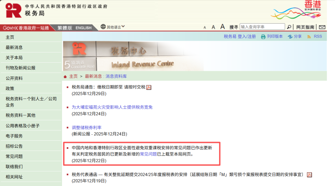 2025年12月22日,香港税务局更新了《内地和香港特别行政区关于对所得避免双重征税和防止偷漏税的安排》的相关解读细则。