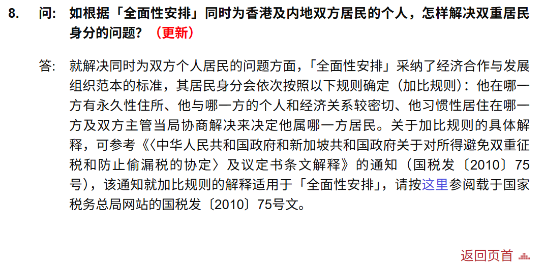 具体如何判定? “全面性安排”采纳了经济合作与发展组织范本的标准,其居民身份会依次按照以下“加比规则”确定: