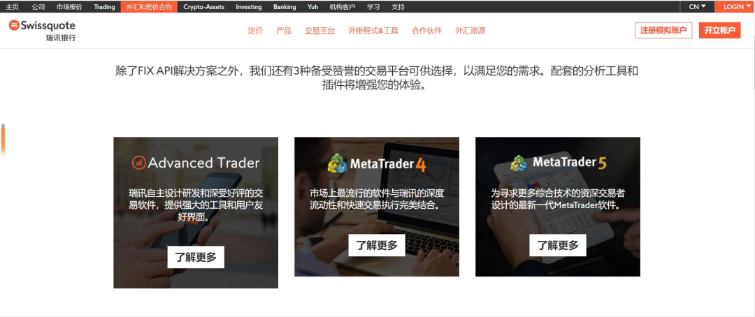 瑞讯银行则是瑞士最大的网上投资银行,是瑞士最大且唯一一家上市外汇银行。全球仅有的三家具备银行资质的外汇经纪商之一,提供网上外汇、差价合约和股指交易以及更为广泛的服务。